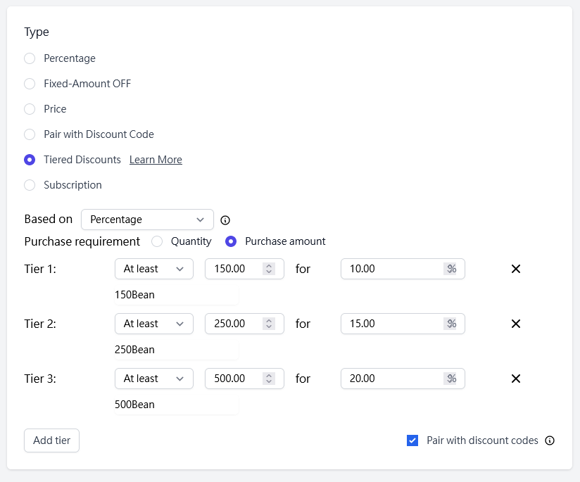 Besides quantity, tiered discounts can now support purchase amounts. For example, you can set up 3 tiers in the BYOB app: